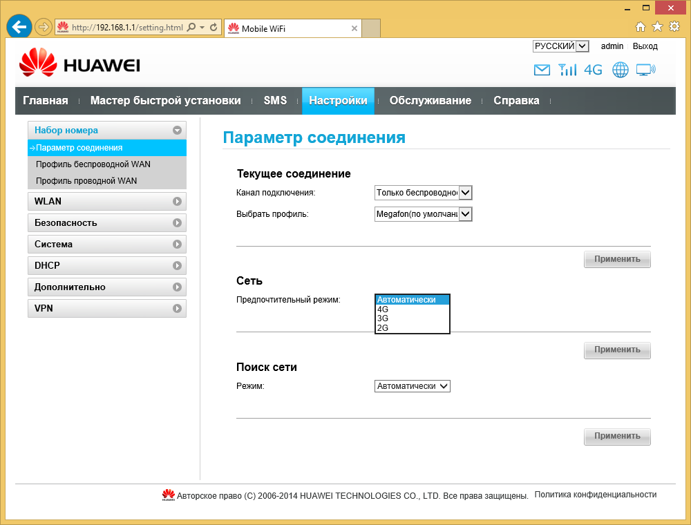 Для беспроводного соединения можно создать несколько профилей с разными настройками APN и быстро переключаться между ними. Отметим, что в интерфейсе есть пункты для работы с PIN-кодом. Для данного типа подключения можно дополнительно выбирать тип сети (автоматически, 2G, 3G, 4G) и оператора.
