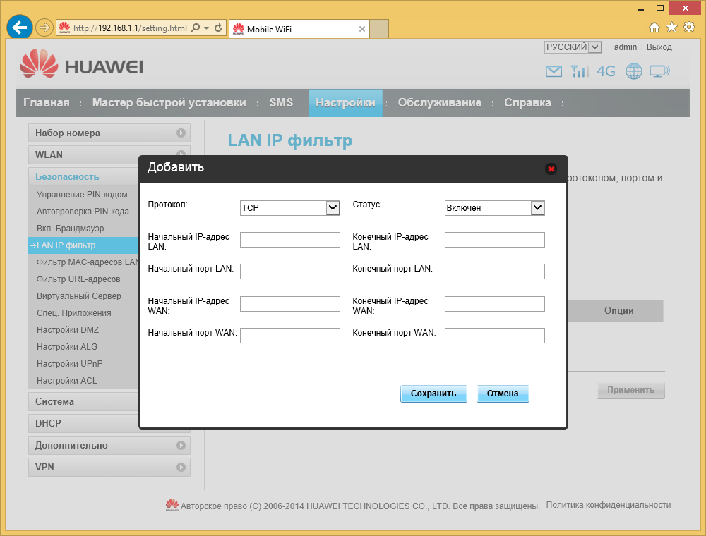 Встроенный межсетевой экран поддерживает работу с пользовательскими правилами, а также имеет защиту от некоторых типов атак. Правила работают на запрет исходящих соединений от клиентов локальной сети. В каждом из них указываются диапазоны IP-адресов и портов для локальной и удаленной системы.