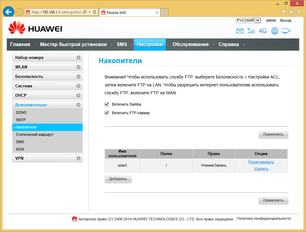 На накопителях поддерживаются файловые системы FAT32, NTFS, EXT2, EXT3. С HFS+ можно только читать данные. Для работы с файлами можно использовать протоколы SMB/CIFS и FTP. При этом сервер FTP можно сделать доступным и из интернета. Отметим, что он поддерживает UTF-8, но никаких детальных настроек у него нет. Система ограничения прав простейшая — можно завести только одного пользователя, выбрать для него корневую папку и права доступа.