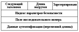 Формат AH достаточно прост и состоит из 96-битового заголовка и данных переменной длины, состоящих из 32-битовых слов. Названия полей достаточно ясно отражают их содержимое: Next Header указывает на следующий заголовок, Payload Len представляет длину пакета, SPI является указателем на контекст безопасности и Sequence Number Field содержит последовательный номер пакета.