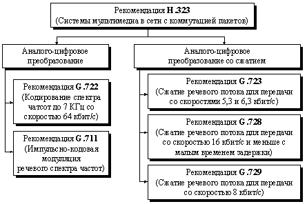 Согласно Рекомендации H.323 для преобразования речевой информации могут применяться алгоритмы, определенные в Рекомендациях МСЭ-Т: G.711, G.722, G.723, G.728 и G.729.
