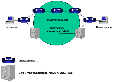 Рис. 3. Использование в транспортной сети Интернет технологий АТМ и Frame Relay