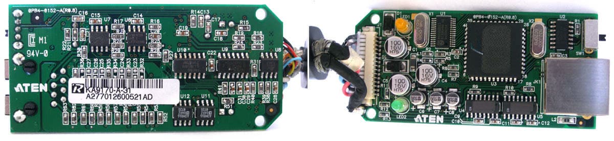 На нижней — три программируемых микроконтроллеров ASIC собственного производства Aten SICG-8018 (которые используются только производителем, и спецификации не опубликованы). Электронные переключатели производства NXP (бывшее микроэлектронное подразделение Philips) и конденсаторы для буферизации интерфейсов, и несколько микросхем с неразборчивой маркировкой, в том числе больших, а также CMOS от Lyontec LY61256JL. Сказать точно, чем занимается такое количество ASIC, невозможно, их основное свойство как раз в программируемости, и в разных моделях они могут выполнять совершенно разные функции. Часть из них скрыта под платой управления цепочкой, снять её не представляется возможным, так как разъёмы закреплены винтами, посаженными на лак, отвернуть их невозможно. Но при взгляде сбоку большие микросхемы видны отчётливо. Место присоединения разъёмов RJ-45 к основной плате экранировано.