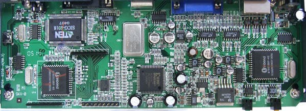Внутренне устройство хорошо видно на фото, построено на ASIC Aten 8018, двух контроллерах Winbond и одном от Xilinx, видны коммутаторы и конденсаторы для буферизации интерфейсов.