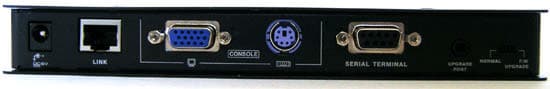 Слева направо: питание, RJ-45, VGA, PS/2 для клавиатуры, последовательный порт, гнездо для прошивки микропрограммы и переключатель режимов, работа и апгрейд. Наличие портов для консоли прямо указывает на то, что устройство может использоваться как в составе KVM, так и самостоятельно. Присоединяем монитор, клавиатуру и целевое устройство к COM-порту, и можно им управлять без участия компьютера. Также можно работать в консоли и с подсоединённой к главному блоку клавиатуры и монитора. Две точки входа, несомненно, повышают удобство использования устройства, особенно если учесть, что расстояние от него до коммутатора может быть до 150 м.
