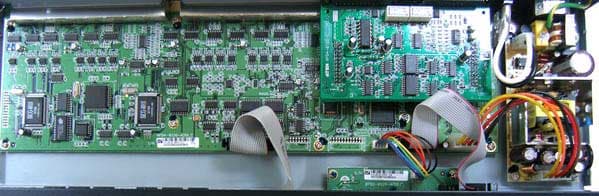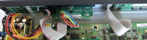 Монтаж на пяти печатных платах, и отдельно блок питания. Самая маленькая за лицевой панелью отвечает за отображение номера устройства в инсталляции, широкая там же содержит кнопки выбора и индикаторы портов, питания и кнопку перезагрузки, между ними смонтирована логика, отвечающая за прошивку (и хранение?) микропрограммы. К основной плате подключены шлейфами. Над ней находится платка, ответственная за организацию цепочки из KVM, на ней — два реле, конденсаторы и коммутаторы NXP.