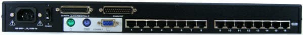 Все разъёмы для коммутации устройств находятся на задней панели, это RJ-45 на каждый канал и VGA, и два PS/2 для консоли. Там же гнездо для кабеля питания с выключателем, выше — два разъёма DB-25 (широкий COM-порт) для организации цепочки.
