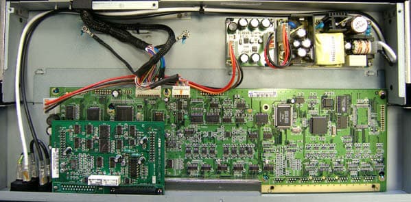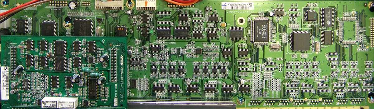 Монтаж на двух печатных платах, и ещё отдельно на двух блок питания. Внизу основной модуль, над ним плата, ответственная за организацию цепочки из устройств. Базу логики составляют микроконтроллеры Winbond и ASIC собственного производства Aten SICG-8018. Также видны электронные переключатели производства NXP (бывшее микроэлектронное подразделение Philips) и конденсаторы для буферизации интерфейсов, и несколько микросхем с неразборчивой маркировкой, в том числе больших. Сказать точно, чем занимаются ASIC невозможно, их основное свойство как раз в программируемости, и в разных моделях они могут выполнять совершенно разные функции.