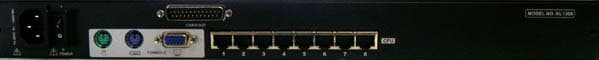 На задней поверхности разъём питания с кнопкой отключения, порты VGA и два PS/2 для подключения внешней консоли. Выше один разъём DB-25 (широкий COM-порт) для организации цепочки. Один потому, что данное устройство логично и единственно возможно использовать в качестве ведущего в инсталляции — оно уже́ содержит консоль. Там же 8 разъёмов формата RJ-45 для подключения серверов.