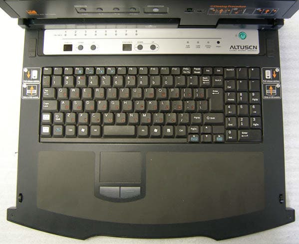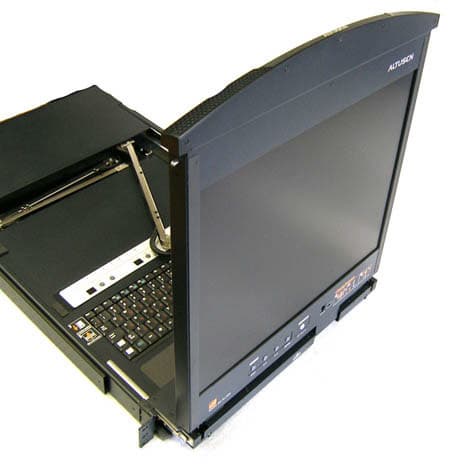 Итак, Cat 5 High-Density Dual Rail LCD KVM Switch ALTUSEN KL1508NRG — устройство для монтажа в стандартную 19" стойку высотой 1U, содержащее 19" ЖК-монитор, клавиатуру с русской раскладкой и тачпад. Также встроен 8-портовый переключатель консоли, поддерживаются ПК с интерфейсом PS/2 и USB, в том числе новые Sun, а также старые Sun и устройства с управлением через ASCII терминал, совместимый с VT100. Подключение осуществляется отдельными для каждого интерфейса клиентскими модулями, соединяемыми с KVM витой парой пятой категории. Оснащено портом для подключения внешнего, работающего параллельно с основным, комплекта из монитора, мыши и клавиатуры (дополнительной внешней консоли), а также портом PS/2 около клавиатуры для дополнительной мыши в дополнение к тачпаду. В ассортименте предложений компании имеется аналогичный KVM на 16 системных блоков. Возможно объединение в цепочку до 31 устройства. Теперь подробнее.