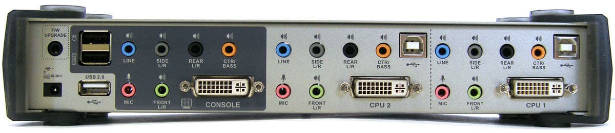 Отличия можно описать в одном абзаце, благо и концепция, и исполнения очень схожи. Более того, практически совпадает и элементная база, и микропрограмма. Различия между устройствами в линейке с единым серийным номером (первые три цифры в названии для настольных, первые две для серверных) ATEN обычно настолько минорны, что мы тестируем только одну из «сестёр», а о вторую и не поминаем. Здесь несколько другой случай. Производитель решил выпускать модель на четыре порта в том же конструктиве, что и двухпортовую. Если посмотреть на заднюю панель, то хорошо видно, что разместить разъёмы ещё для двух каналов там невозможно. Поэтому было решено отказаться от поддержки 7.1 канального звука, остались привычные два стереоканала для каждого ПК. Естественным образом из комплекта поставки исчез четырёхканальный аудиокабель. Однако за исключением этого все характеристики такие же, как и у двухпортовой модели. Так что решайте сами, что для вас важнее, — четыре ПК или шесть каналов звука.