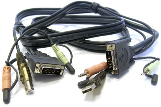 Главный кабель содержит три отдельных шнура, объединённых вместе изоляцией: USB, он же мышь и клавиатура (все четыре возможных устройства используют один порт компьютера), звуковой с двумя миниджеками с каждого конца и DVI-D Dual Link, в котором разведены все контакты, предусмотренные стандартом, кроме аналоговых. Это четыре штырька рядом с ножевым контактом, легко убедиться, что их нет. Провода достаточно толстые и качественные, гнутся с некоторым трудом. Скажем сразу, что устройство не содержит каких-либо «фирменных» разъёмов, и вполне возможно использование любых стандартных интерфейсных проводов, например, аудиофильских.