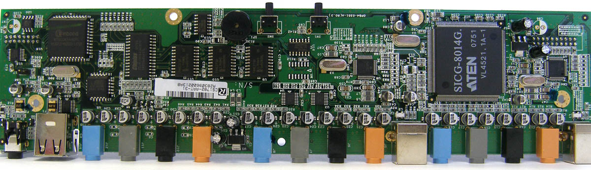На верхней плате коммутаторы для других интерфейсов, также производства уважаемой европейской компании NXP, конденсаторы для буферизации интерфейсов в целях безопасного «горячего» подключения и управляющие ASIC производства самой Aten и Winbond. Монтаж аккуратный.