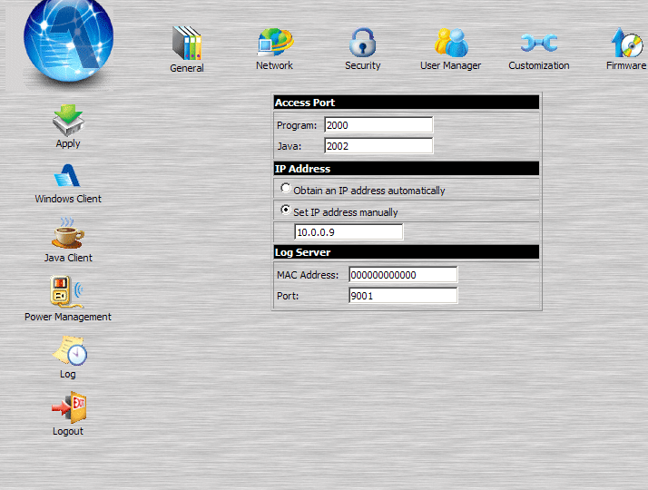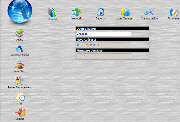 Верхние иконки открывают разделы, связанные с конфигурированием CN-6000. По большей части, все опции там повторяют опции интерфейса Windows-утилиты Admin Tool, но есть некоторые отличия. К примеру, в данном окне (конфигурирование сетевых адресов) мы можем задать только IP-адрес устройства, но не можем указать маску подсети и шлюз. К тому же, задание IP-адреса работает как то криво — мне так и не удалось сменить IP-адрес устройства с веб-интерфейса (с помощью утилиты Admin Tools он менялся без проблем).