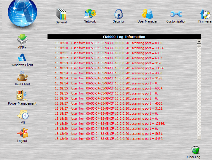 Иконка Log, расположенная в левой части веб-интерфейса, позволяет посмотреть события, происходившие при работе устройства. В данном случае скриншот отражает логи, которые появились в момент тестирования устройства программой Nessus.
