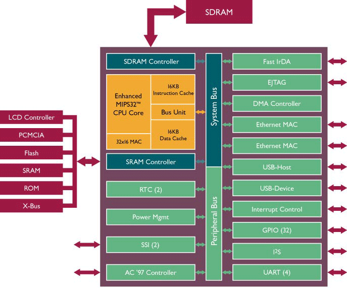 Устройство собрано на процессоре AMD Alchemy AU1000, базирующемся на архитектуре MIPS32. Это 32-битный процессор с частотой 500Mhz имеет 16Kb кеш инструкций и 16Kb кеш данных. В процессор встроено два 10/100Mbit Ethernet-контроллера, контроллер USB (device & host), а также 100/125Mhz SDRAM и SRAM/Flash EPROM контроллеры доступа к памяти. Процессор, работая на частоте 500Mhz потребляет всего 900mW.