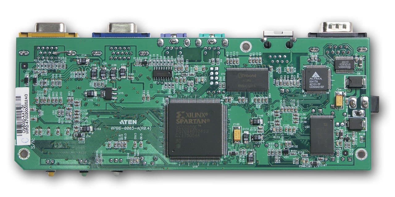 А на обратной стороне печатной платы расположена микросхема XC2S200E, которая является матрицей программируемой логики из семейства Spartan-IIE компании Xilinx.