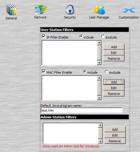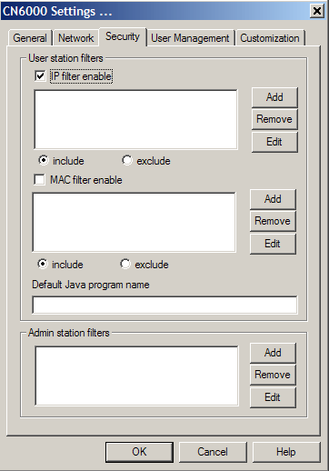 В закладке Security настраиваются фильтры (по MAC и/или IP адресам) доступа к удаленному экрану администрируемых компьютеров, а так же фильтр на администрирование самого CN-6000.