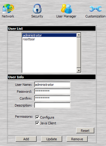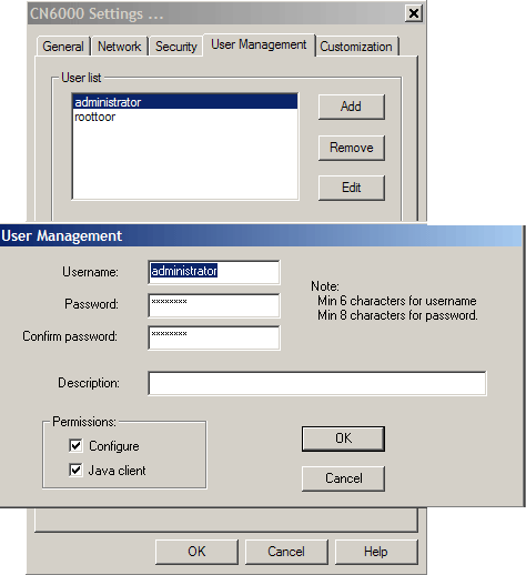 В следующей закладке задаются имена и пароли пользователей, а так же их права. Что примечательно, можно ограничить логины на конфигурирование CN-6000 и использования JAVA-клиента. Минимальная длина пароля, которую принимает утилита конфигурации, равен восьми символам. Жаль конечно, что пароль не проверяется на "простоту", но даже проверка длины пароля говорит о том, что безопасности ATEN уделяет внимание.