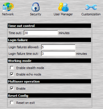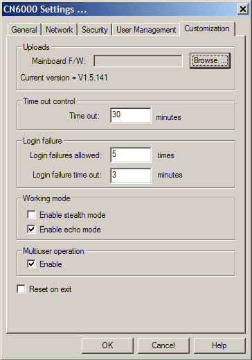 Последняя закладка позволяет обновить прошивку устройства, включить возможность одновременного коннекта к удаленному компьютеру нескольким людям (правда мышка и клавиатура все равно одна, с точки зрения управляемого компьютера, поэтому один управляет, остальные — смотрят… или мешают друг другу, перетягивая мышь в разные стороны). Тут же настраивается реакция на неправильный процесс аутентификации, а так же включение различных режимов "скрытия" CN-6000 (отсутствие реации на ping и запрет на показ себя при автоматическом поиске устройств в локальной сети через клиентскую утилиту или утилиту администрирования).