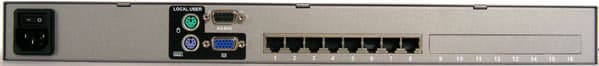 Все разъёмы для коммутации устройств находятся на задней панели. Это по одному стандартному гнезду RJ-45 на каждый канал. Для консоли разъём VGA и два PS/2, для мыши и клавиатуры. Кроме того, там же гнездо для кабеля питания с выключателем и разъём стандартного COM-порта для прошивки микропрограммы, подписанный как Admin.