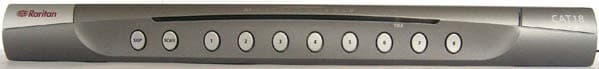 Продолговатая металлическая коробка, на лицевой стороне восемь кнопок для переключения каналов, по совместительству являющихся и индикаторами. У шестнадцатипортовой модели также восемь кнопок, но они поделены по горизонтали пополам, с первым каналом совмещён девятый и так далее. Также индикатор питания и кнопки Skip и Scan, и индикатор (second-)Tier. Передняя панель с претензией на дизайн, форма с плавными обводами. Цвет в общем-то серый, но с нежным золотисто-коричневым оттенком, что помешает любителям подбирать наполнение серверного шкафа в одном тоне ;-) Нет, я таких не встречал, но если выпускают чёрные и тёмно-синие серверные корпуса, то может быть и есть такие эстеты? В остальном дизайн простой и утилитарный, на верхней поверхности в металле выштампован большой логотип производителя.