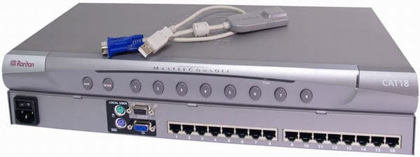 И обратим внимание на недавно анонсированные в серии MasterConsole два устройства с общим индексом CAT, MCCAT18 и MCCAT116. Они отличаются друг от друга только количеством портов. На тестах побывали два восьмипортовых переключателя, но по ним можно создать исчерпывающее представление о серии. Несмотря на начальный уровень, они используют для подключения серверов небольшие модули, соединяемые с самим коммутатором стандартным кабелем «витая пара» пятой категории. Объём таких кабелей гораздо меньше и фирменных комбинированных, и стандартных проводов для коммутации периферии. Максимальное количество управляемых компьютеров в случае каскадирования семнадцати модулей MCCAT116 составляет 256, что говорит о хорошей масштабируемости инсталляций на их основе. Также производитель среди преимуществ серии заявляет высокое качество видеосигнала, удобное управление при помощи кнопок и экранного меню и защиту доступа паролем.