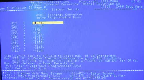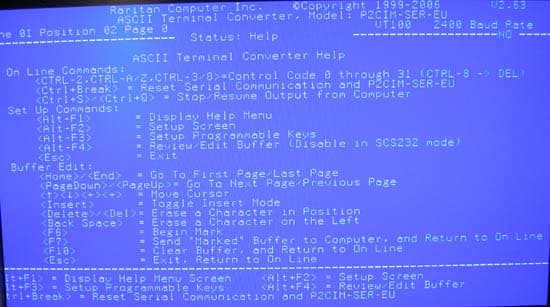 Устройство достаточно интеллектуальное, поддерживает настройку параметров соединения, назначение макросов для двенадцати функциональных клавиш длиной до шестнадцати символов и позволяет просматривать циклический буфер сеанса объёмом до восьми экранов. Размер экрана — 24 строки по 80 символов, фон чёрный. Подробнее изучить характеристики устройства можно в PDF файле (1 Мб). Там же хорошо описаны параметры настройки через собственное меню. Основано на чипе от Atmel AT89C51RD2, поддерживает прошивку микропрограммы.