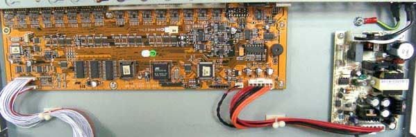 Третья плата размещена за лицевой панелью и содержит переключатели и светодиоды, к ней доступ не такой простой и решено было оставить её в покое. Соединены платы между собой шлейфами, монтаж везде аккуратный, компоненты качественные.
