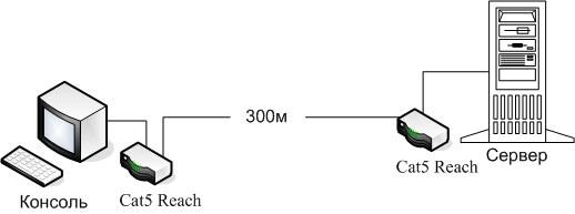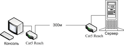 Наиболее простым устройством данного класса является Cat5 удлинители. Cat5 Reach у Raritan позволяет разнести пользовательскую консоль и управляемую систему по медной паре 5 категории на 300 метров (рис 1). Параллельным продуктом от Aten является CE-700R (150м), от Avocent — LongViewR (до 170м).