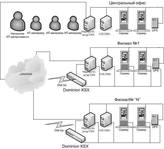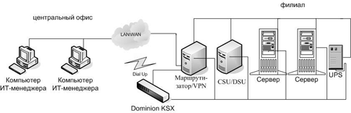 В дополнение к рисунку 5 следует отметить, что Dominion, так же как и IP Reach позволяет подключать Power Conrol и осуществлять Dial Up дозвон на встроенный модем, то есть Вы получаете возможность дистанционно управлять оборудованием и настраивать сеть, даже если она полностью выйдет из строя.