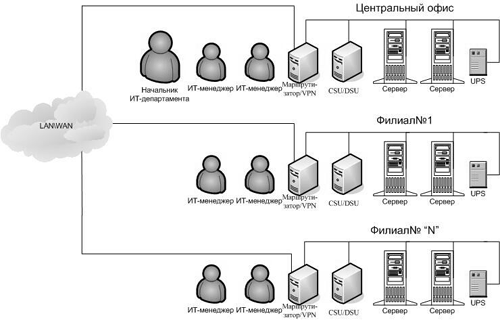 - получаем возможность из центрального офиса осуществлять полнофункциональное высококвалифицированное управление ИТ-системой, а на месте нам потребуется лишь один аварийный администратор, функциональность которого будет сводиться к замене вышедших из строя комплектующих (жесткий диск, блок питания и т.д.). Данные процедуры не предполагают необходимости наличия высокой квалификации и поэтому вакансию смело можно отдавать на аутсорсинг третьей стороне.