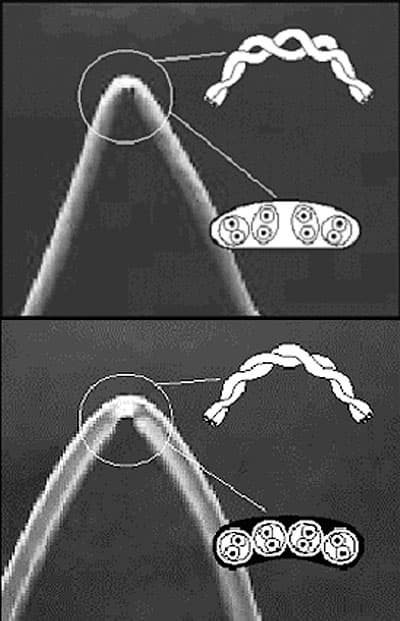 Стандарт RJ45 (можно встретить название соединителя 8Р8С) пришел в мир компьютерных сетей из телефонии. Он предусматривает несимметричное разъемное соединение. Модульные соединители семейства RJ выпускаются в двух вариантах, ориентированных на кабели с различным типом жилы. Забегая немного вперед, укажем на то, что у гибких коммутационных шнуров (плоских модульных двух-, четырех-, шести- или восьмижильных Cat.3 и четырех витых пар Сат.5) жила состоит из нескольких проволок. Поэтому для изготовления таких кабелей необходимо использовать соединитель с контактом, врезающимся в тело жилы. У монтажного кабеля жила выполнена из монолитного медного проводника, поэтому для монтажа этих кабелей используются соединители с разрезным контактом. Соответственно, если соединитель не предназначен для данного типа кабеля, то и добиться качественного контакта не удастся.