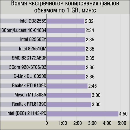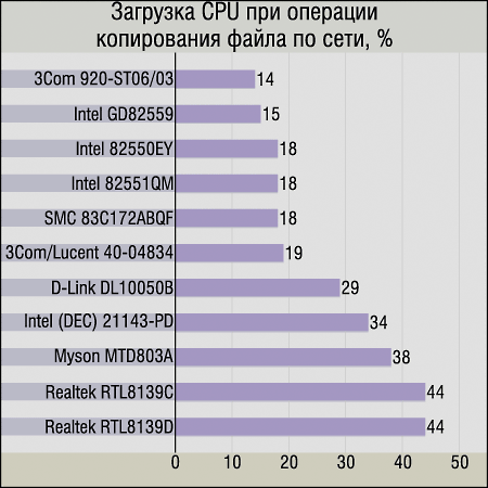 Intel GD82559 (карта InBusiness 10/100). Этому самому дешевому сетевому решению от Intel явно чуть-чуть «убавили сообразительность», впрочем, сохранив все другие положительные свойства чипов этой компании. И даже нагрузка на CPU упала, а поддержка полнодуплексного режима наоборот — лучшая среди всех участников! Вполне удачное решение для «рядовой» машины, как нам кажется.