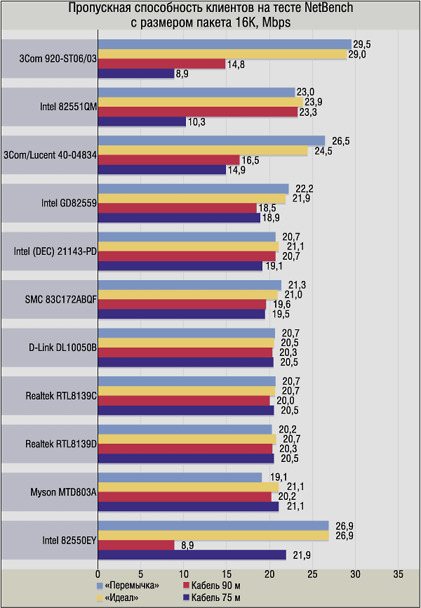 Дополнительно они используют так называемые «адаптивные технологии», позволяющие регулировать объем передаваемой в сети информации и величину задержки с тем, чтобы максимально полно использовать возможности конкретного окружения и достигать наибольшей общей пропускной способности сети. Похоже, в нашем случае карты, расположенные на «неудобных» (или, корректности ради, оговоримся — сочтенных неудобными согласно заложенному алгоритму анализа) сегментах, «добровольно уступали» часть полосы своим собратьям, находящимся в лучших условиях. Следует заметить, что выигрыша в общем объеме передаваемых данных это все же не принесло — если сложить все значения пропускной способности по каждому из клиентов, их сумма будет примерно такой же, как в случае с более «прямолинейными» картами. В целом же мы пока воздержимся от оценки этой особенности некоторых сетевых чипов на уровне «хорошо/плохо», ибо в зависимости от конкретных условий функционирования сети и решаемых в ней задач она легко может изменяться в каждом конкретном случае на диаметрально противоположную.