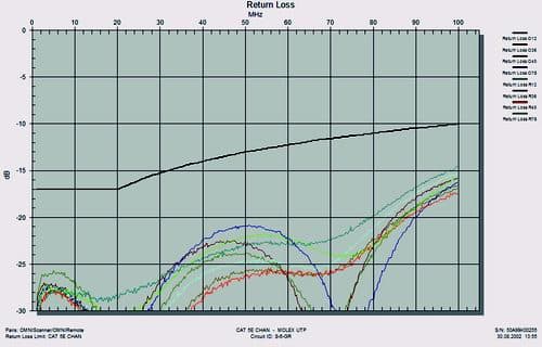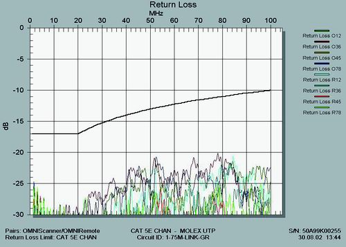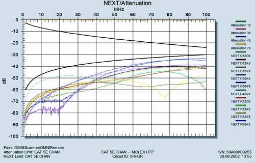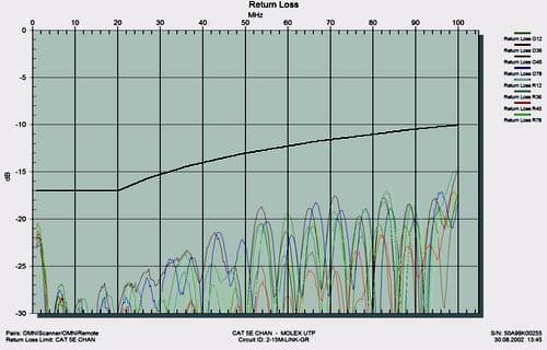 Таким образом, вместо требуемой для полноты эксперимента одной пары разъемных контактов мы получили возможность подсоединить еще две, включив их в разрыв цепи от концентратора до машины дополнительным коммутационным шнуром. В Тестовой лаборатории обычно не принято доверять даже известным брэндам без соответствующего инструментального подтверждения, поэтому сразу после инсталляции была не только проверена правильность подключения и распределения кабельных жил, но и измерены количественные параметры каждого из отрезков с помощью портативного анализатора OMNIScanner II от Fluke Network.