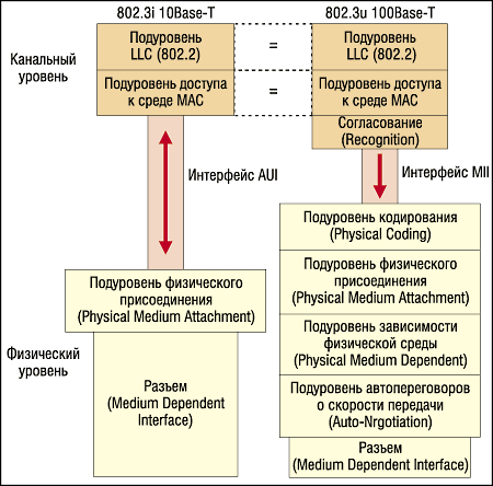 Из рисунка (в терминах и категориях семиуровневой модели OSI) видно, что отличия Fast Ethernet от Ethernet сосредоточены на физическом уровне. Стандарт 100Base-T (802.3u) установил три различные спецификации для физического уровня для поддержки следующих типов кабельных систем: