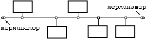 Все компьютеры подключаются к одному кабелю. На его концах должны быть расположены терминаторы. По такой топологии строятся 10 Мегабитные сети 10Base-2 и 10Base-5. В качестве кабеля используется коаксиальный кабель. Нарушение общего кабеля или любого из двух терминаторов приводит к выходу из строя участка сети между этими терминаторами (сегмент сети). Отключение любого из подключенных устройств на работу сети никакого влияния не оказывает.