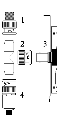 2. Т-коннектор. 3. Разъем сетевого адаптера компьютера или другого устройства сети. 4. Разъем на кабеле сети. |