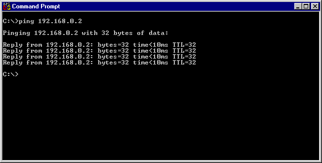 Например для Windows 95/98/NT, вы запускаете "DOS" окно: "Start" - "Programs" — "Command Prompt" ("Пуск" — "Программы" — "Сеанс MS-DOS") и в появившемся окне набираете ping 192.168.0.2, если вы хотите услышать ответ от 192.168.0.2