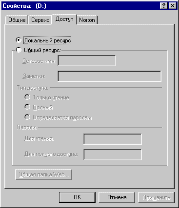 | Выберите пункт "Общий ресурс", сетевым именем станет буква диска или название каталога. Вы можете это изменить как вам нравится, с учетом некоторых ограничений, налагаемых на используемые знаки. Я, обычно, оставляю как есть, чтобы самому потом не путаться. Здесь также можно изменить тип доступа и ограничить все это паролями. Нажимаем "OK" | ![]() |