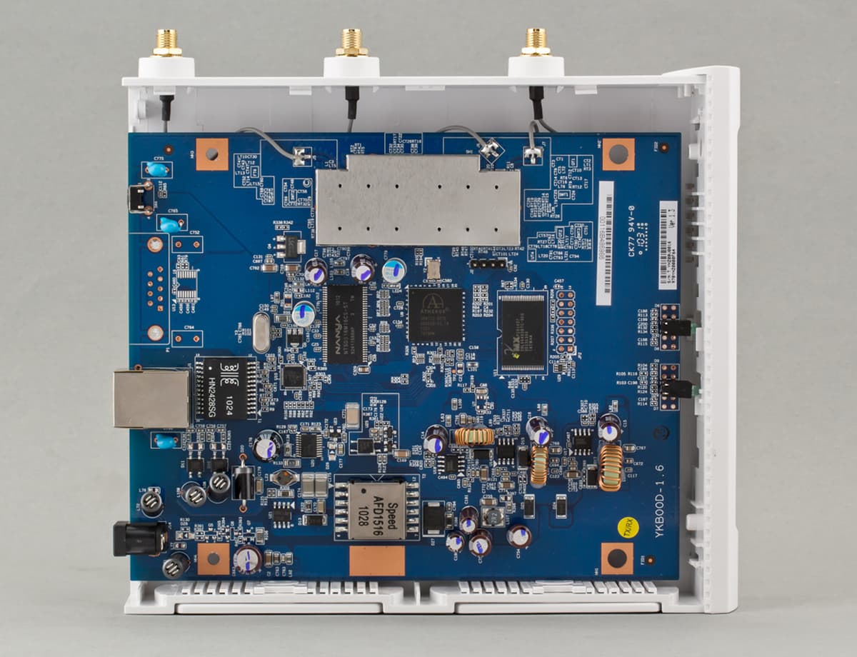 Точка доступа собрана на базе платформы компании Atheros. Основной процессор — AR9132, гигабитный сетевой контроллер AR8021, радиоблок AR9103 (MIMO 3×3, 2,4 ГГц, 300 Мбит/с), объем оперативной памяти составляет 32 МБ, прошивка находится во флеше объемом 8 МБ. Аналогичную конфигурацию мы видели в прошлом обзоре точки доступа 802.11n, который был опубликован год назад. Интересно будет посмотреть, насколько могут отличаться реализации разных производителей. Антенны к устройству подключаются через стандартные разъемы, так что при необходимости их можно будет заменить на любые другие.