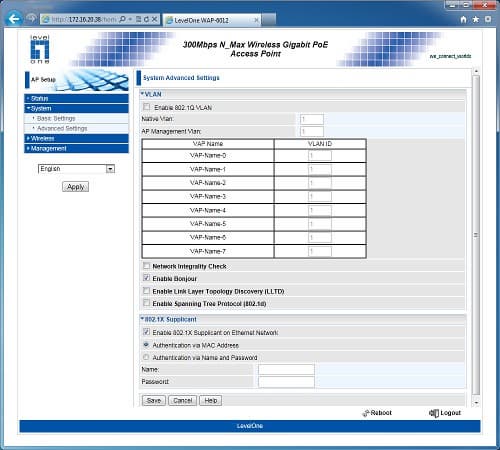 Системные настройки разместили на двух страницах. На первой пользователь указывает сетевое имя, регион (для выбора доступных радиоканалов), IP-адрес устройства и настраивает часы. Рассматриваемая точка доступа может работать также и простейшим сервером DHCP. Вторая страница используется для дополнительных сетевых настроек. В частности, можно настроить VLAN и назначить каждой виртуальной точке доступа свою группу и включить аутентификацию по протоколу 802.1X.
