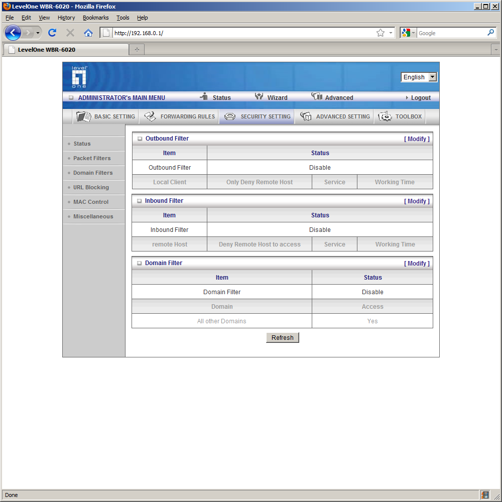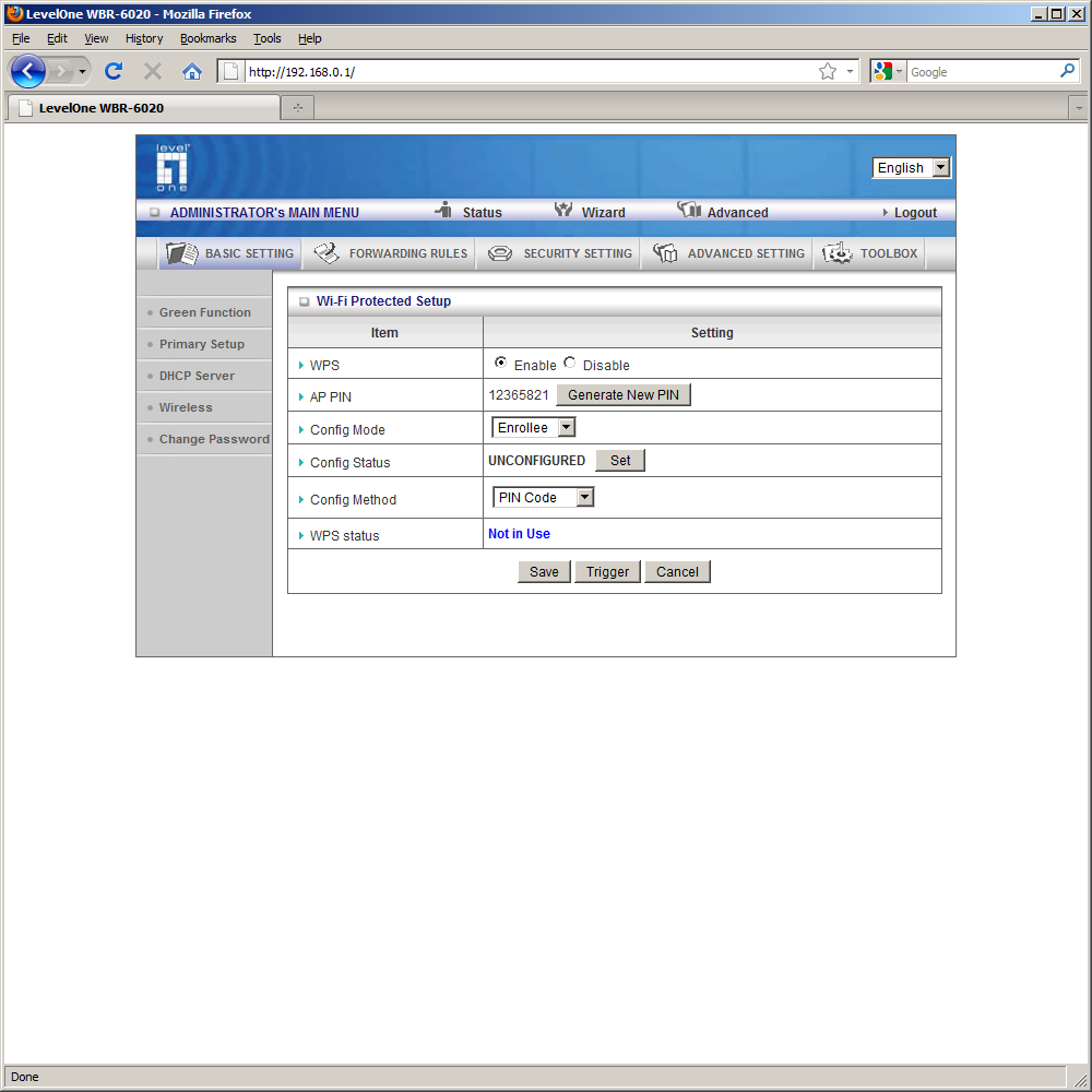 Для полного управления функциями WBR-6020 нужно использовать web-интерфейс. Русской версии у него, к сожалению, нет. Интересной особенностью является отображение на первой странице интерфейса текущей информации по подключениям и статистике. Она доступна даже без ввода пароля.