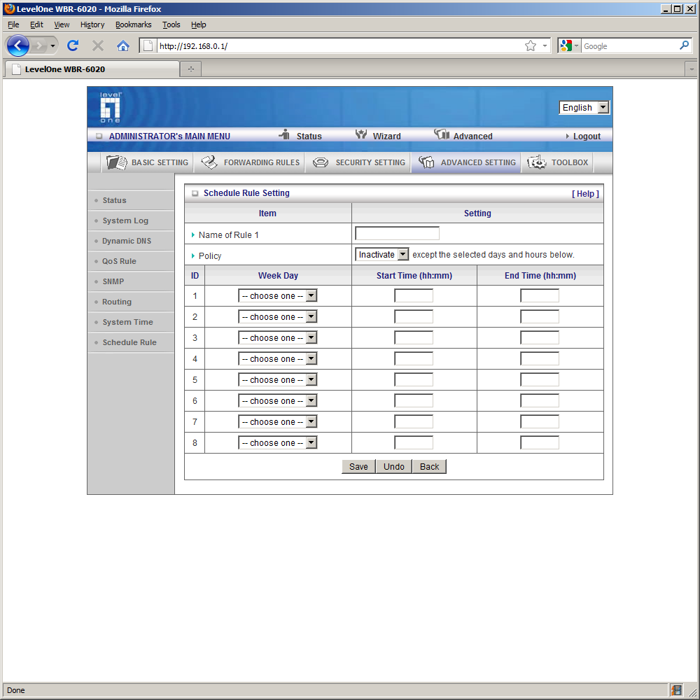 Достаточно интересно выглядит группа «Advanced Settings». В ней есть страницы системного логфайла, отправки сообщений по электронной почте (возможно указание имени и пароля для доступа к SMTP-серверу) и на сервер Syslog, настройка клиента DDNS (поддерживаются четыре сервиса), указания правил QoS, настройка протокола SNMP, настройки динамической и статической маршрутизации (до восьми пользовательских маршрутов), настройки встроенных часов и программирования расписаний, на которые можно ссылаться во многих других функциях (например, для работы беспроводного модуля).