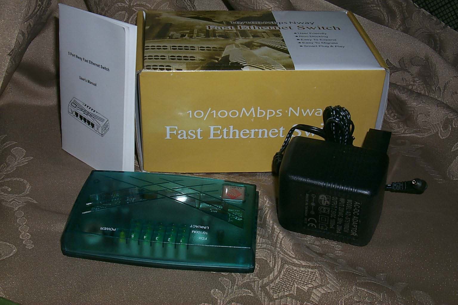 Комплект поставки стандартен: пяти-портовый коммутатор, внешний блок питания к нему и небольшая брошюрка с документацией на устройство.