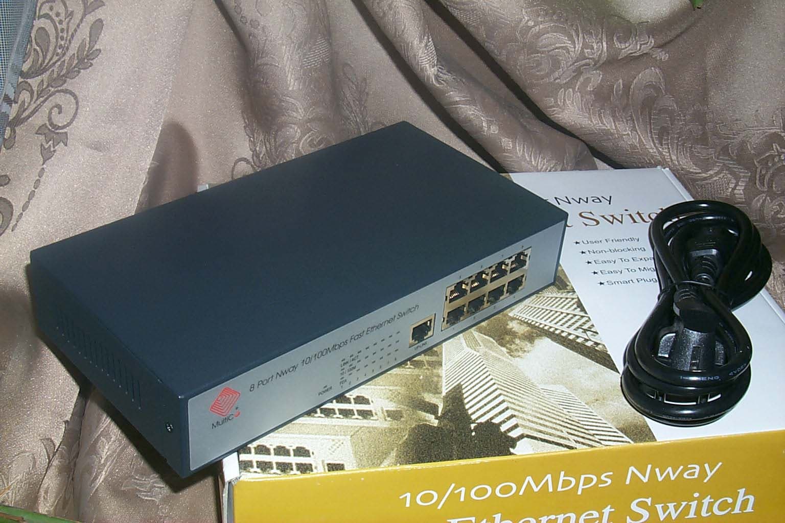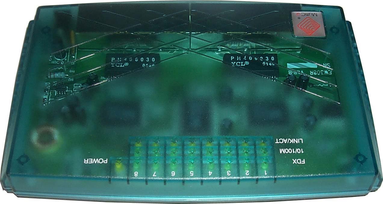 Устройство с традиционным для MultiCo прозрачным элегантным корпусом. В комплекте сам коммутатор, блок питания и документация в виде брошюры. По виду не отличается от такого же пяти-портового (кроме увеличения числа портов).