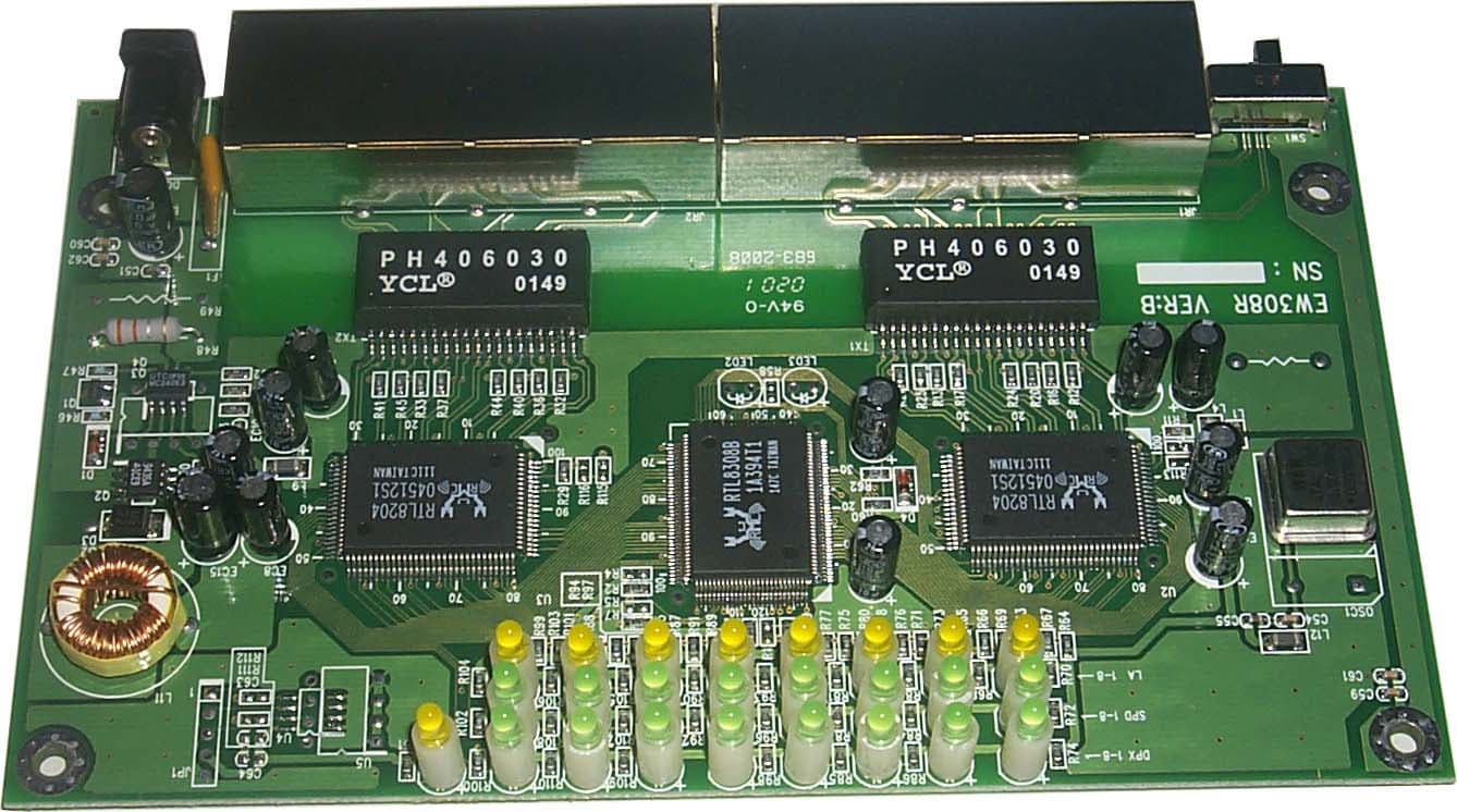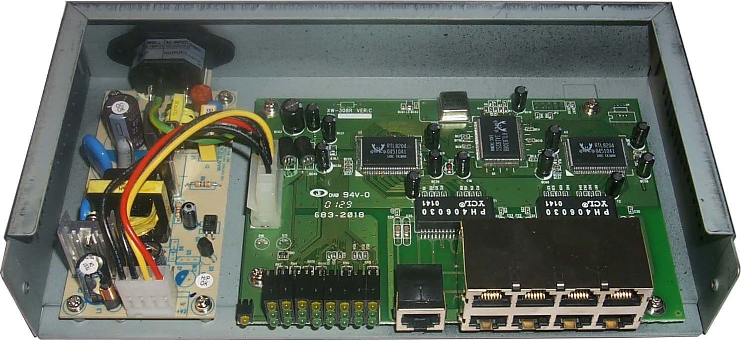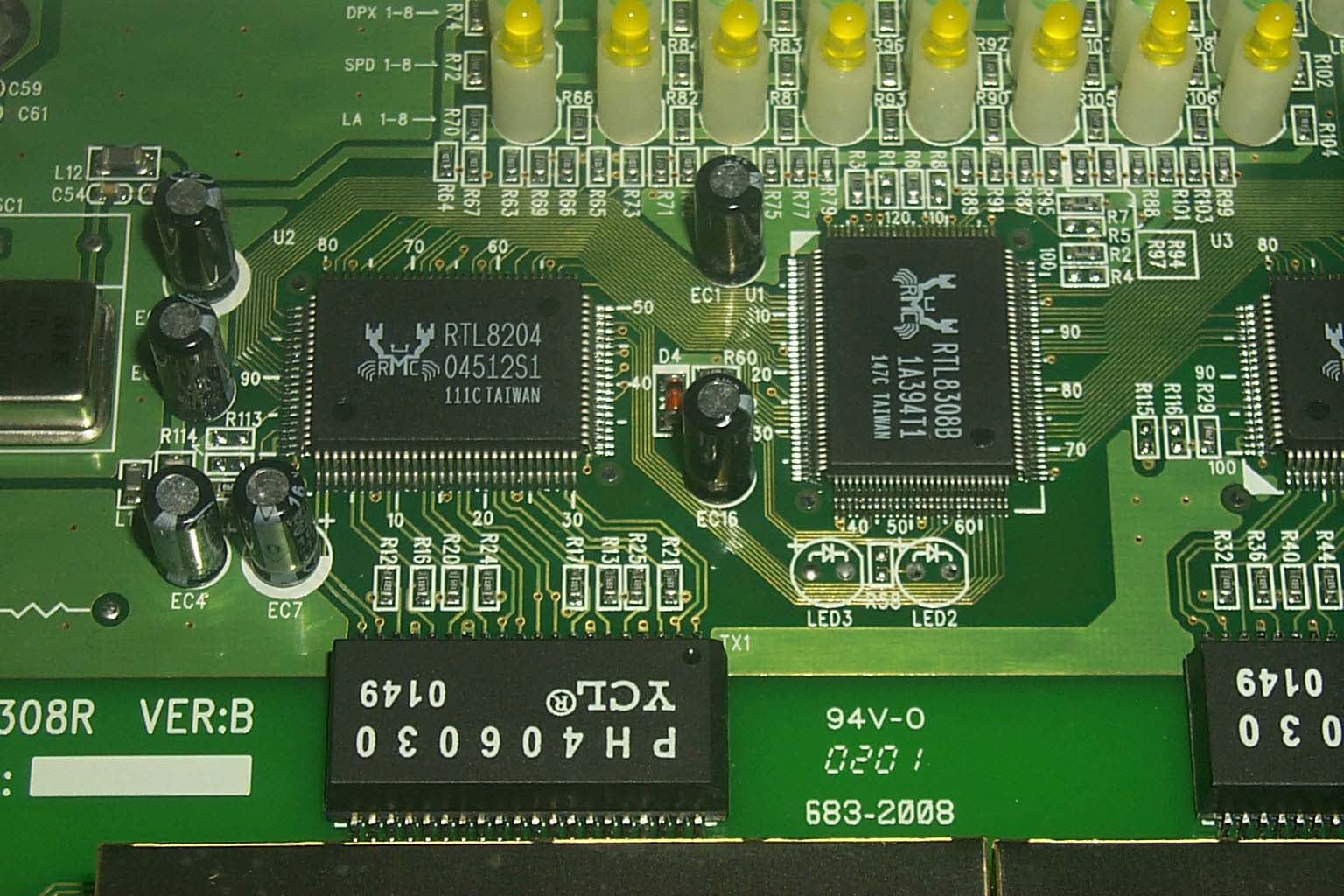Оба устройства собраны на восьми-портовом 10/100 Ethernet Switch микроконтроллере RTL8308B компании Realtek. Он имеет встроенный буфер кадров объемом 2 мегабита и таблицу MAC адресов на 8K записей (по 1K на порт). Более подробно о нем рассказано обзоре миникоммутатора TRENDnet TE100-S88E.