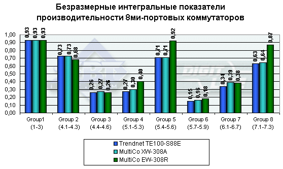 Теоретически показатели должны быть равными или близкими друг к другу, так как все три устройства собраны на одном и том же микроконтроллере. Но мы видим, что это не совсем так… Возможно, это просто погрешность, но в некоторых группах тестов она получается слишком уж большой. В последующих тестах будет использована более свежая версия IOMeter и, возможно, еще одна программа — посмотрим на разницу. Анализируя результаты, видим — в максимально загруженном режиме оба коммутатора работают без претензий, а вот в режимах с различными параметрами среды передачи на разных портах начинаются непонятные падения скорости. Так как подобное присутствует и на всех предыдущих протестированных устройствах, пока еще неясно, в чем тут может быть дело. Я все же склоняюсь к версии о несовершенстве методики тестирования.