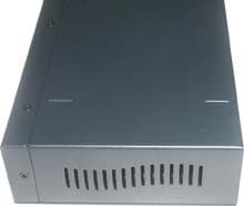 Металлический корпус коммутатора MultiCo XW-308A с этих ракурсов выглядит немного скучновато — ведь индикация и порты выведены на переднюю панель, сзади остался только разъем питания. К портам также можно подключать экранированную и неэкранированную витую пару, аплинк представлен девятым портом, но он совмещен с первым. Корпус значительно больше модели INT, но надо учитывать, что внутри у него, помимо электроники коммутатора, находится еще и блок питания. Для установки на горизонтальную поверхность можно наклеить резиновые ножки, идущие в комплекте.